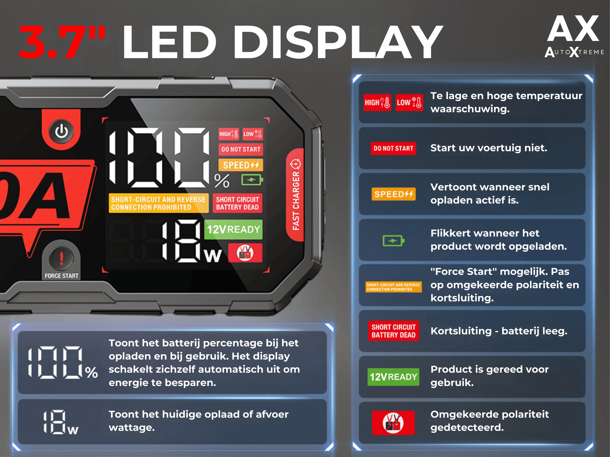 - Geforceerde startfunctie: Ideaal voor een batterij met te laag voltage.