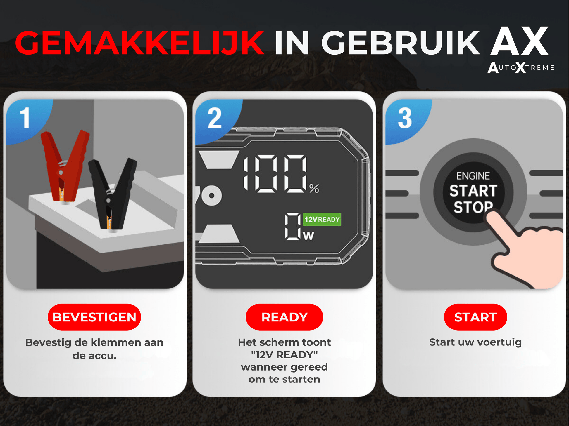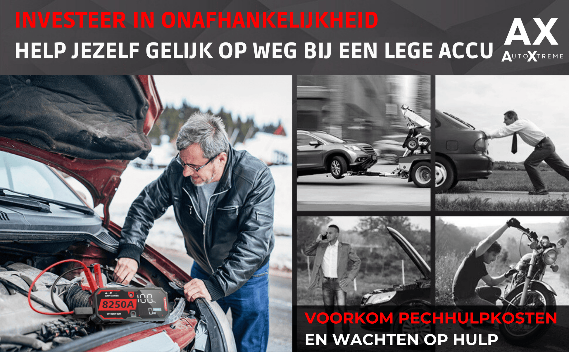 Helaas hebben we het allemaal weleens gehad: u wilt vertrekken, maar uw auto start niet. Met onze jumpstarters is dat verleden tijd. Volg simpelweg de stappen in de handleiding en u bent snel weer op weg. Investeer in onafhankelijkheid en help uzelf op weg!
